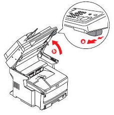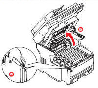 Push lever (a) to release OKI ES8460 toner cover and lift in